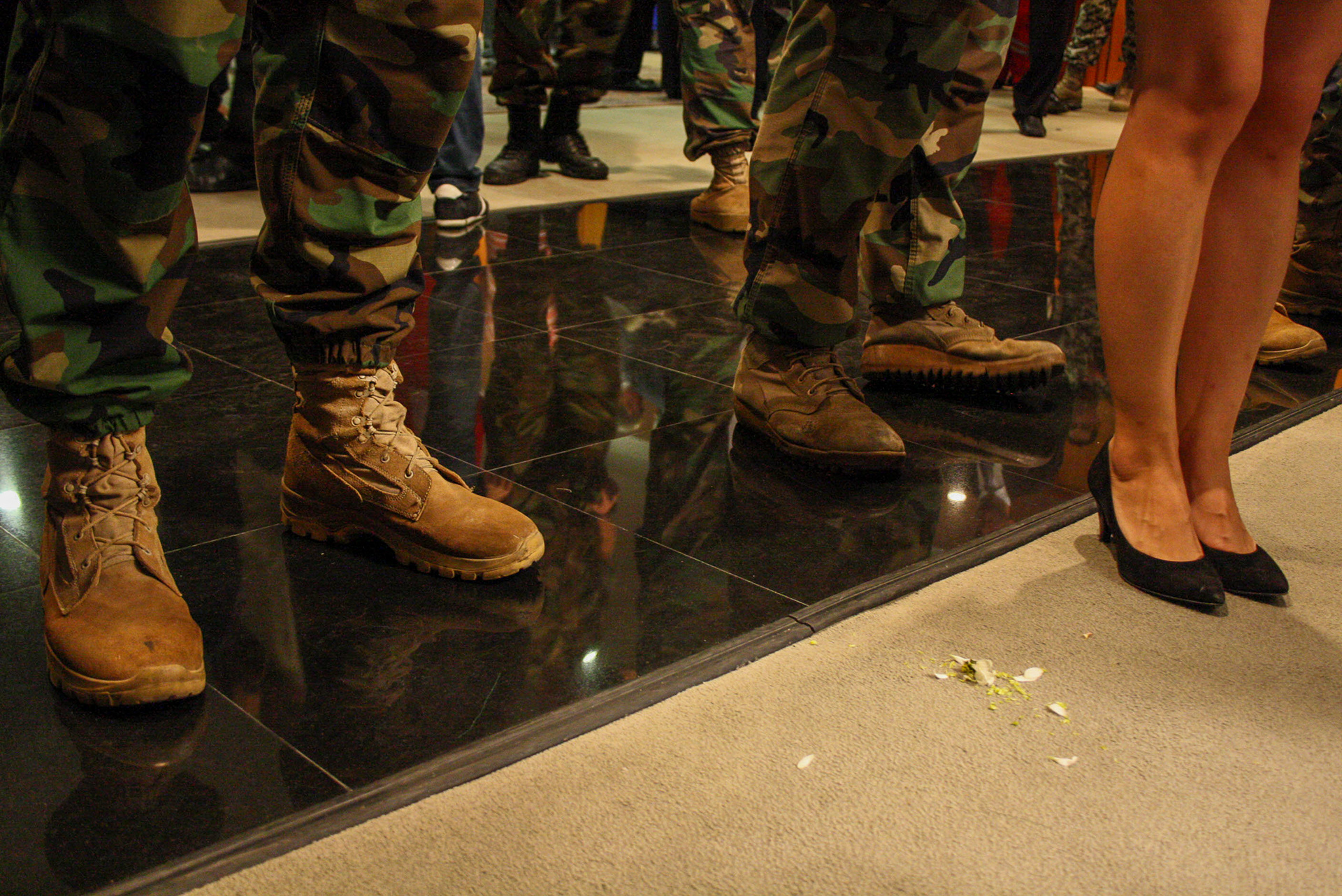 At Beirut’s international airport, a woman’s heels face the boots of soldiers, a quiet intersection of formality and force.