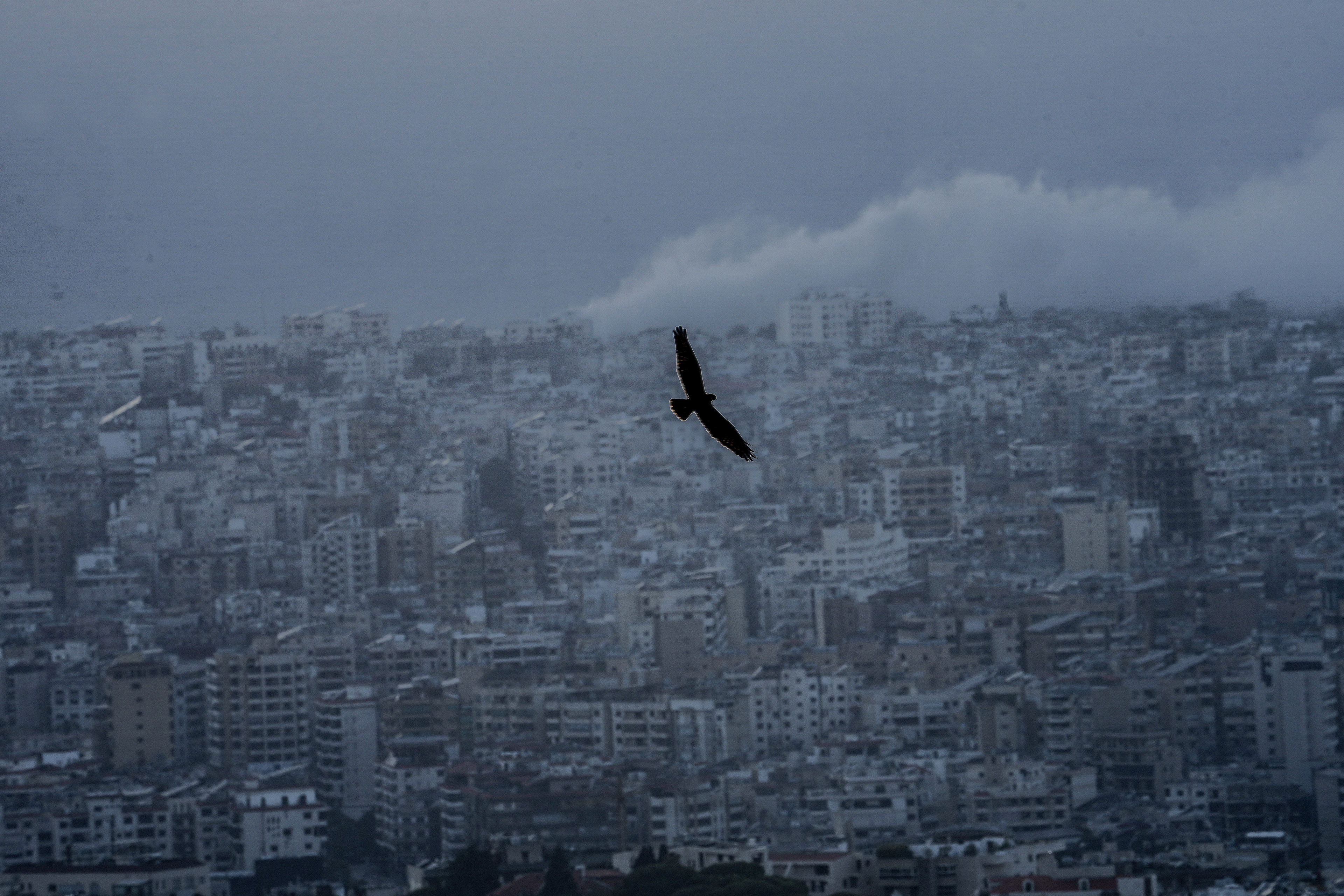 A lone bird glides above Beirut, its wings cutting through the smoke of a wounded city, rising over the southern suburbs following Israeli airstrikes.