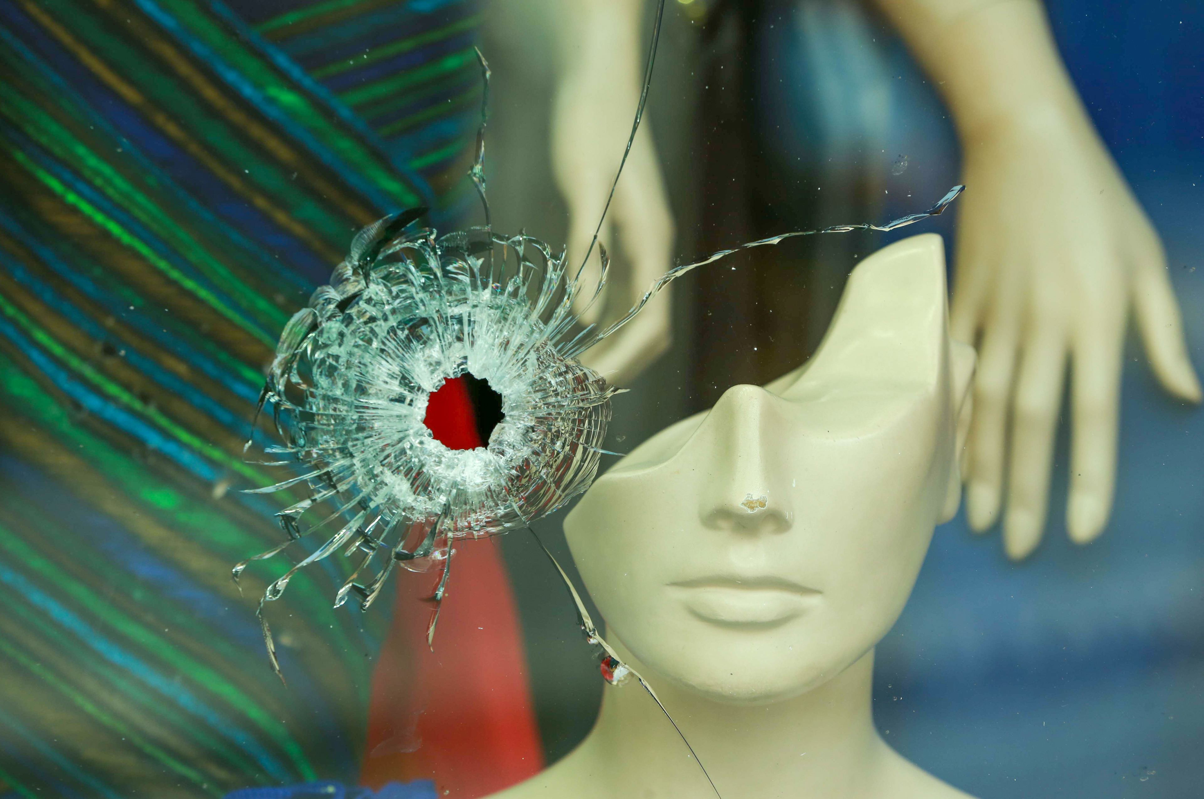 mannequin is seen behind a shattered shop window in the old souks of Tripoli after days of clashes between the Lebanese army and militias