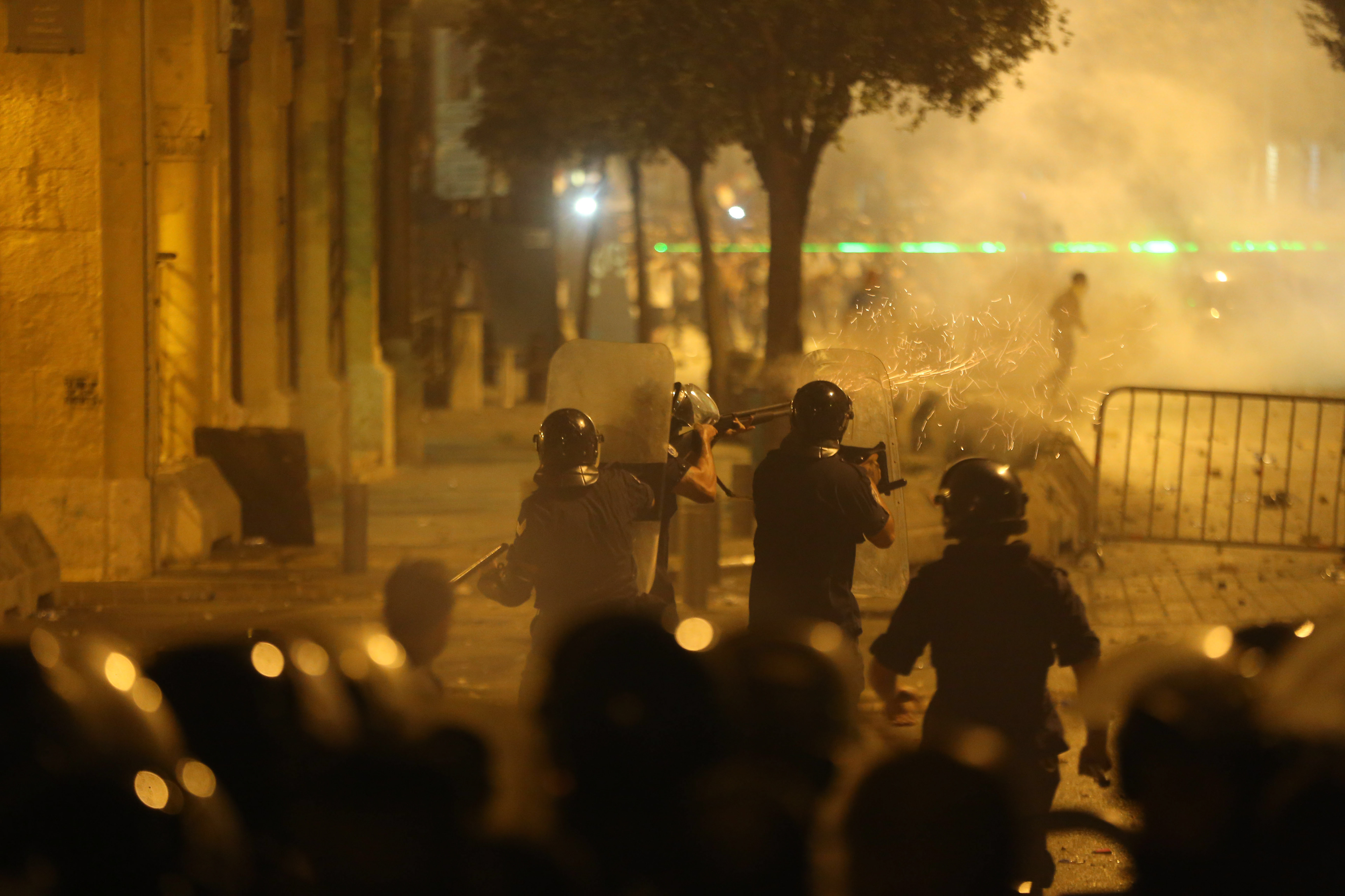 Police shoots gas bombs directly on protesters while a second riot police is covering him with a shield in Riad Al Solh square