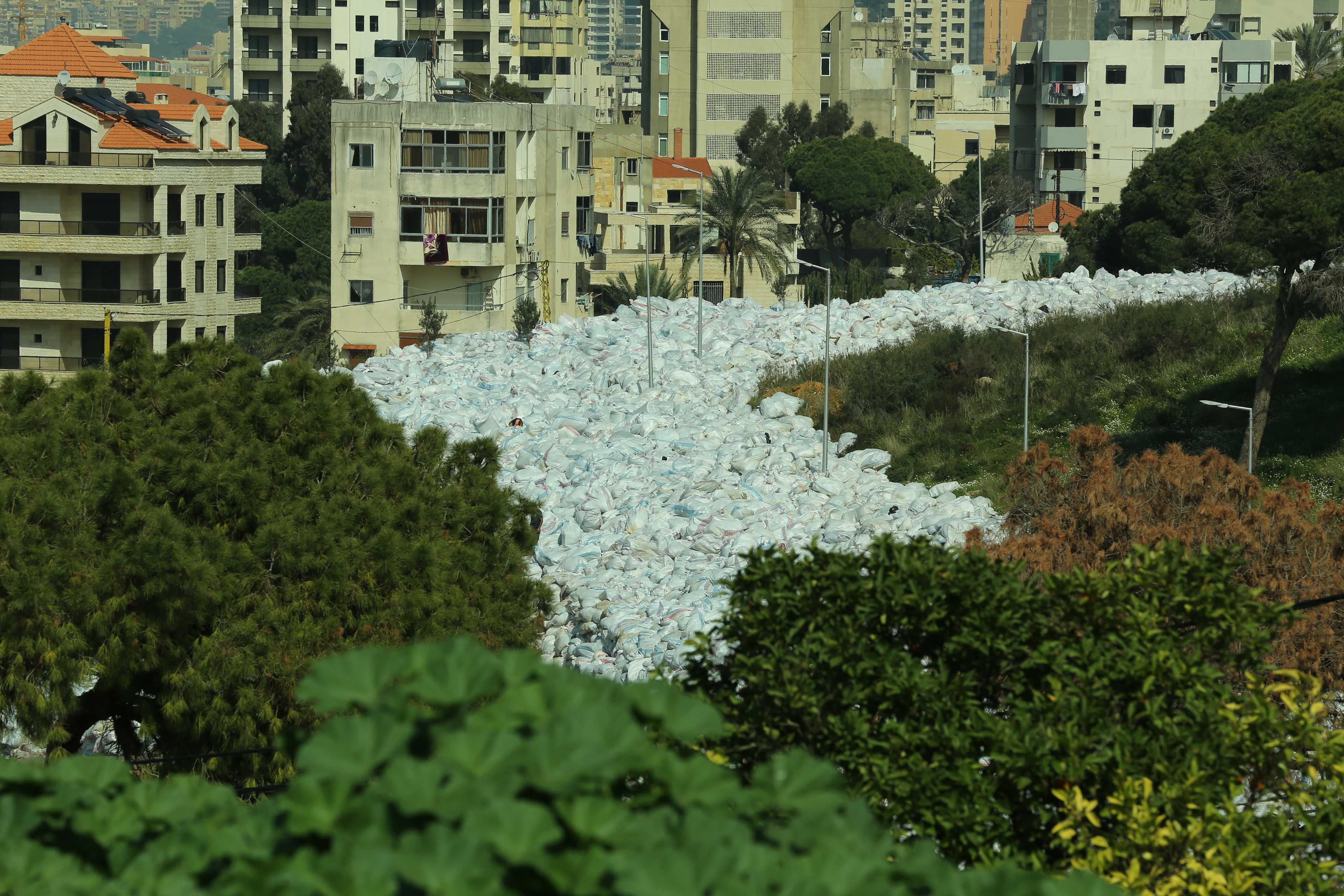 The garbage river is seen from a distance, as media called it “the white river” in Al Karantina area